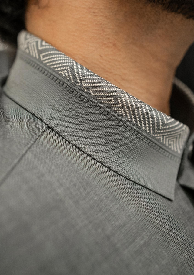 Il présente une patte centrale épurée avec boutons métalliques signature ton sur ton. Le col révèle un motif intérieur chevron (herringbone) discret, apportant profondeur et finition haut de gamme sans surcharge visuelle.